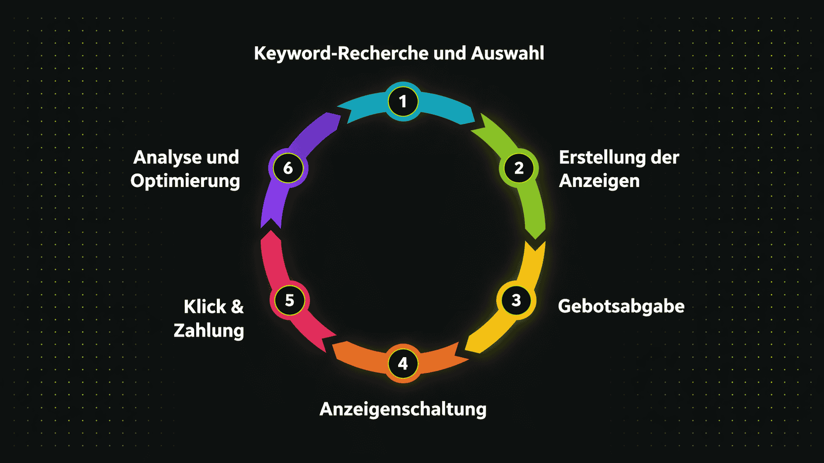Wie läuft eine PPC-Kampagne genau ab? Hier eine archetypische Darstellung, welche den Zyklus einer Pay-per-Click (PPC) Kampagne veranschaulicht.